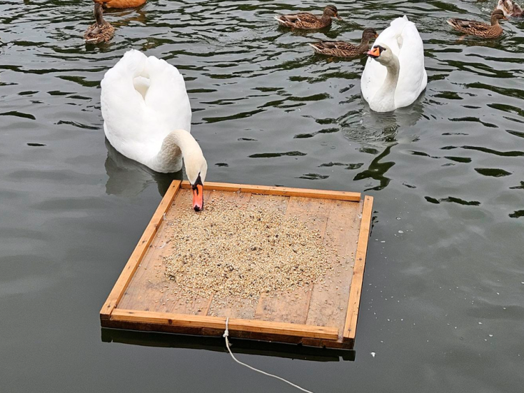 Кормушка для уток и лебедей на воде .